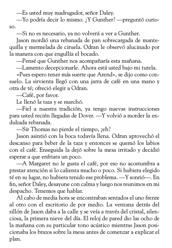 Jason fue educado según las costumbres inglesas, de manera que sus manías y su lenguaje ayudan al lector a encontrarse cómodo con sus apariciones. Sin descuidar el rigor de un jefe del servicio de inteligencia, Jason toma decisiones conforme a su posición, muy por encima del papel de Odran. Por ese motivo (y el lector lo verá en la trilogía) Odran le respeta y admira.